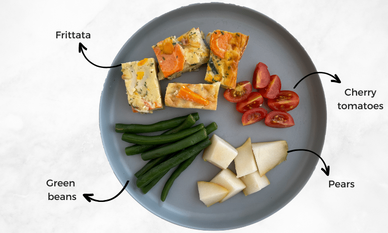 Frittata + beans + tomato + pear